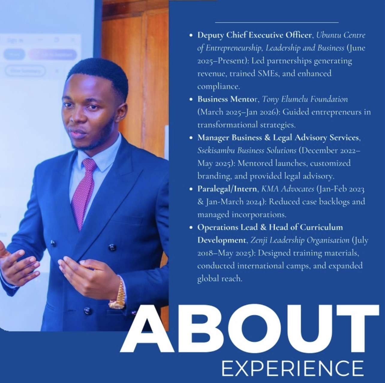 Isaac went on to found and lead Zenji Leadership Organisation, co-build Prepare Consultants, a study-abroad company, and later establish Ssekisambu Business Solutions, a legal and business advisory firm that has directly managed over 20 SME portfolios and trained 5,000+ entrepreneurs online.